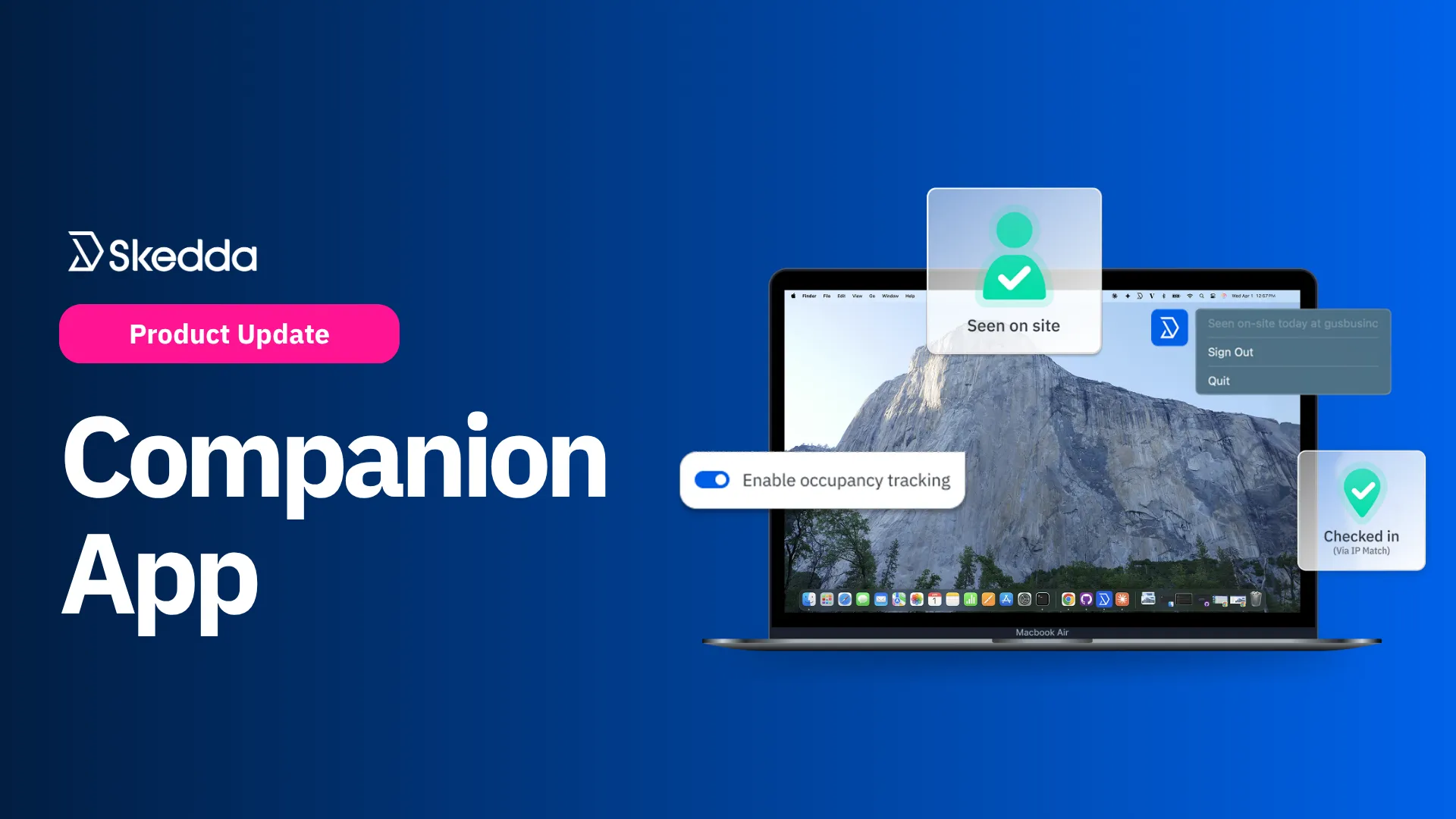In one lightweight desktop app, the Skedda Companion App brings together Wi-Fi-based presence detection, automatic check-ins, cross-platform support for Mac and Windows, and a privacy-first design built for workplace use.