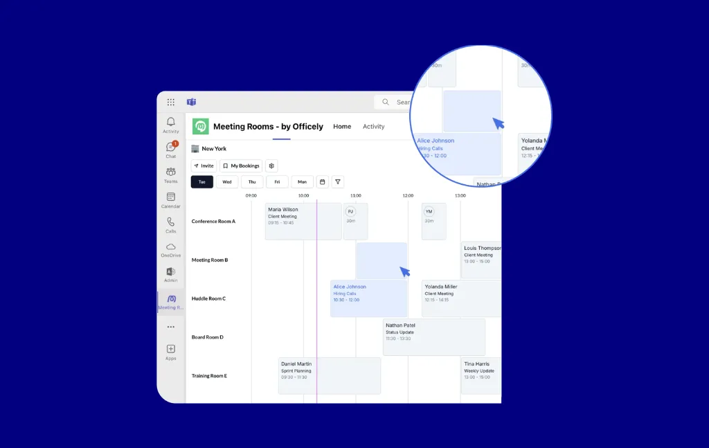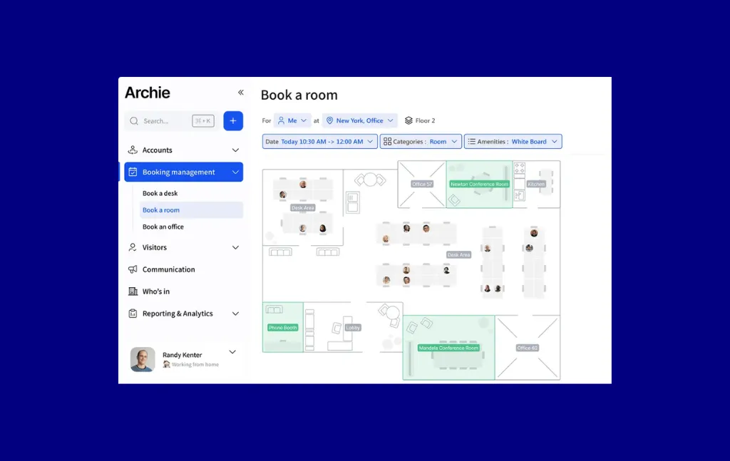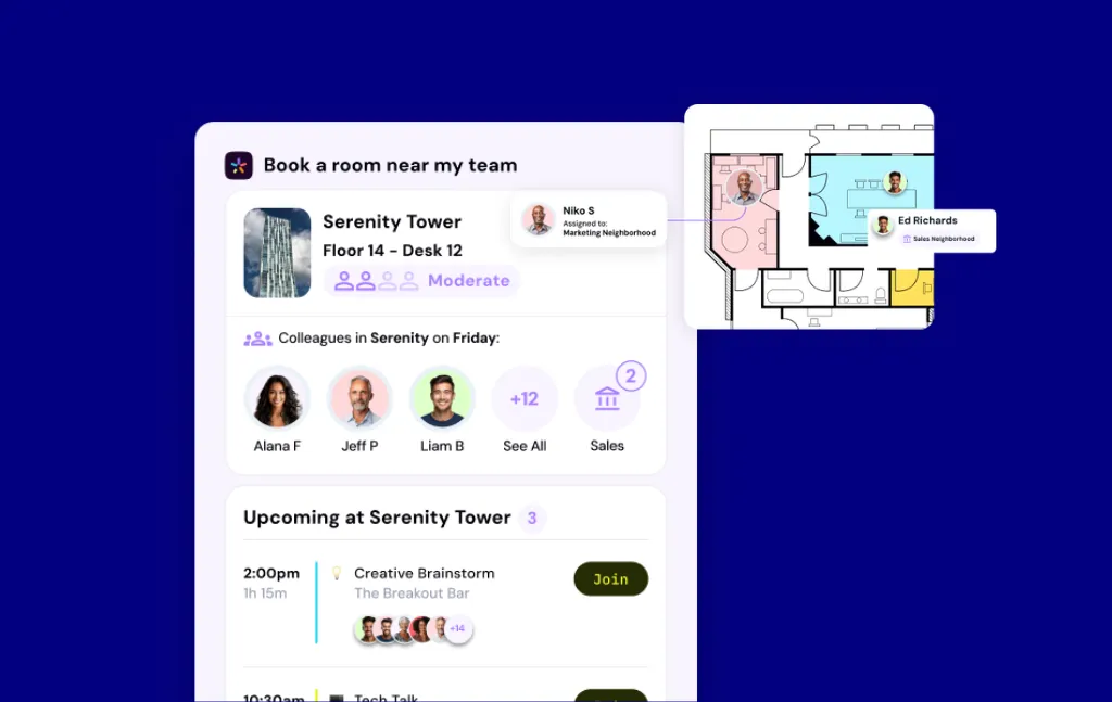 - Find & Book: surfaces the best available room by filters and teammate proximity