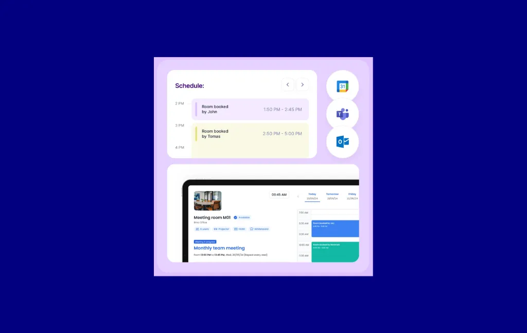- Room booking from Google Calendar or Microsoft Outlook with auto-release on no-check-in