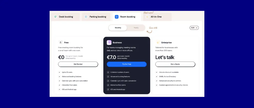 Per user. Free tier up to 1 room and 20 users. Business tier starts at €5.5 per room and unlimited users. All-in-One €2.5/user/month (annual) with meeting rooms as an add-on. Enterprise from €125/location/month. Annual billing saves 20%. 14-day free trial.