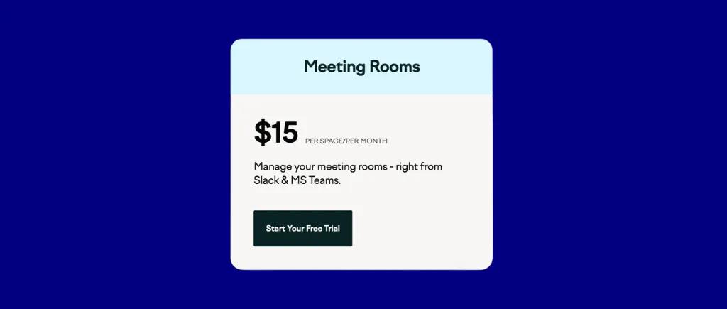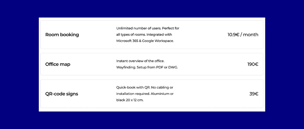 Sub-€2/user/month entry price with a native Microsoft Teams app and two-way calendar sync makes it the lowest all-in per-user entry for meeting room access in this comparison.