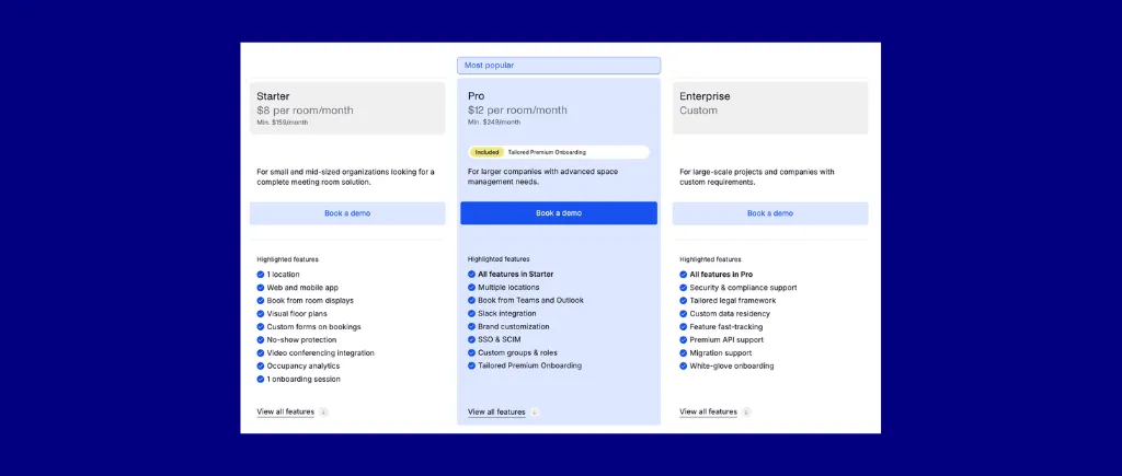 Higher space counts scale differently across models. Skedda and similar published-tier tools move into Enterprise custom quotes at higher volumes.