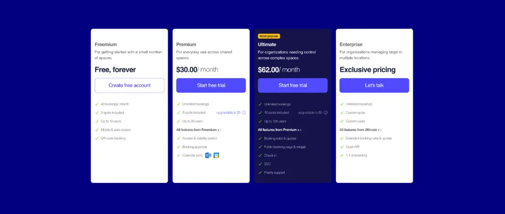Per-space pricing with unlimited users, fast self-serve deployment, custom floor plans, and the deepest integration coverage of any published-price tool in this category.