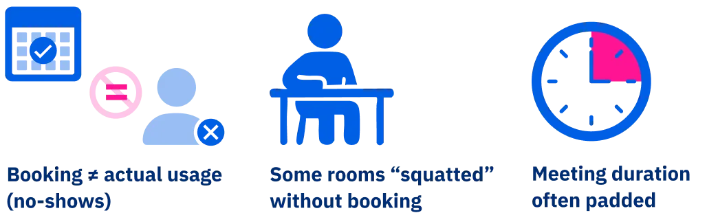 Booking systems capture intent to use space before anyone walks through the door. They tell you who books spaces (desks, meeting rooms, parking spaces), what types of spaces are in high demand, when spaces are reserved or released, cancellation and no-show rates, and how often individuals or teams book shared resources.